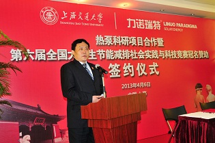 4月6日上午,“力诺瑞特杯”第六届全国大学生节能减排社会实践与科技竞赛冠名赞助签约仪式在上海交通大学新体育馆100号贵宾厅成功举行。山东力诺瑞特新能源有限公司总经理申文明先生、副总经理任勇先生、副总经理李云彬先生,美国普渡大学机械工程学院院长Bajaj教授,上海交通大学校长、中科院院士张杰教授,副校长黄震教授,机械与动力工程学院常务副院长奚立峰教授、副院长刘应征教授、副院长林赫教授,制冷与低温工程研究所所长、太阳能发电及制冷教育部工程中心主任王如竹教授等领导嘉宾以及部分媒体代表出席了签约仪式。
